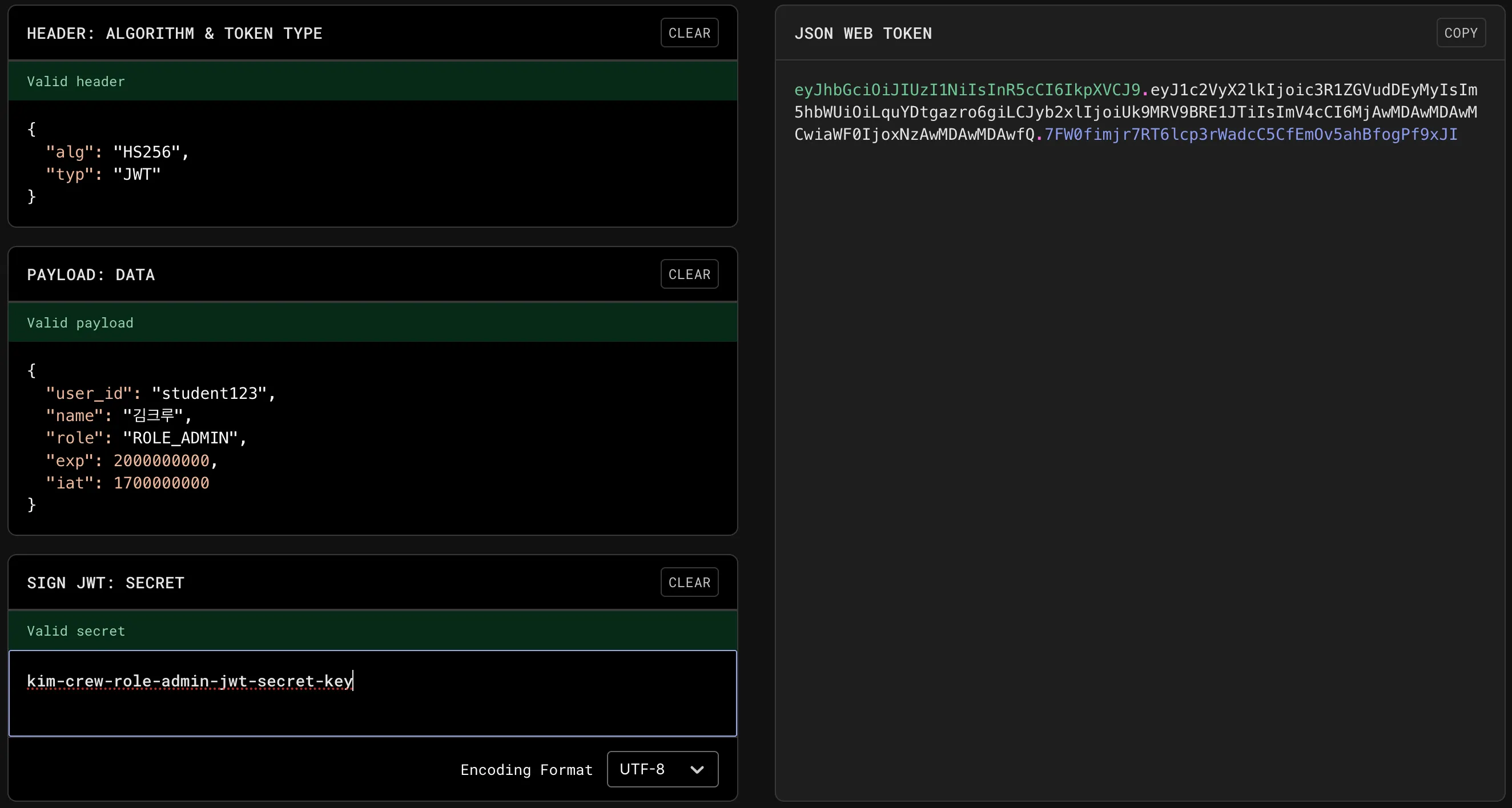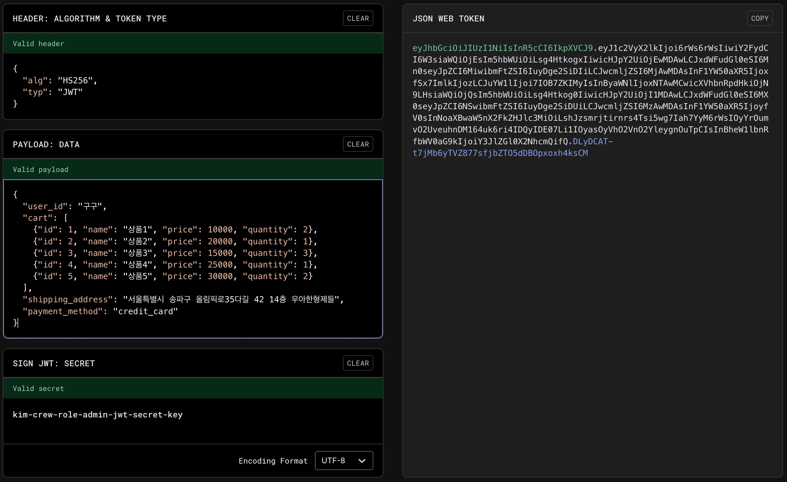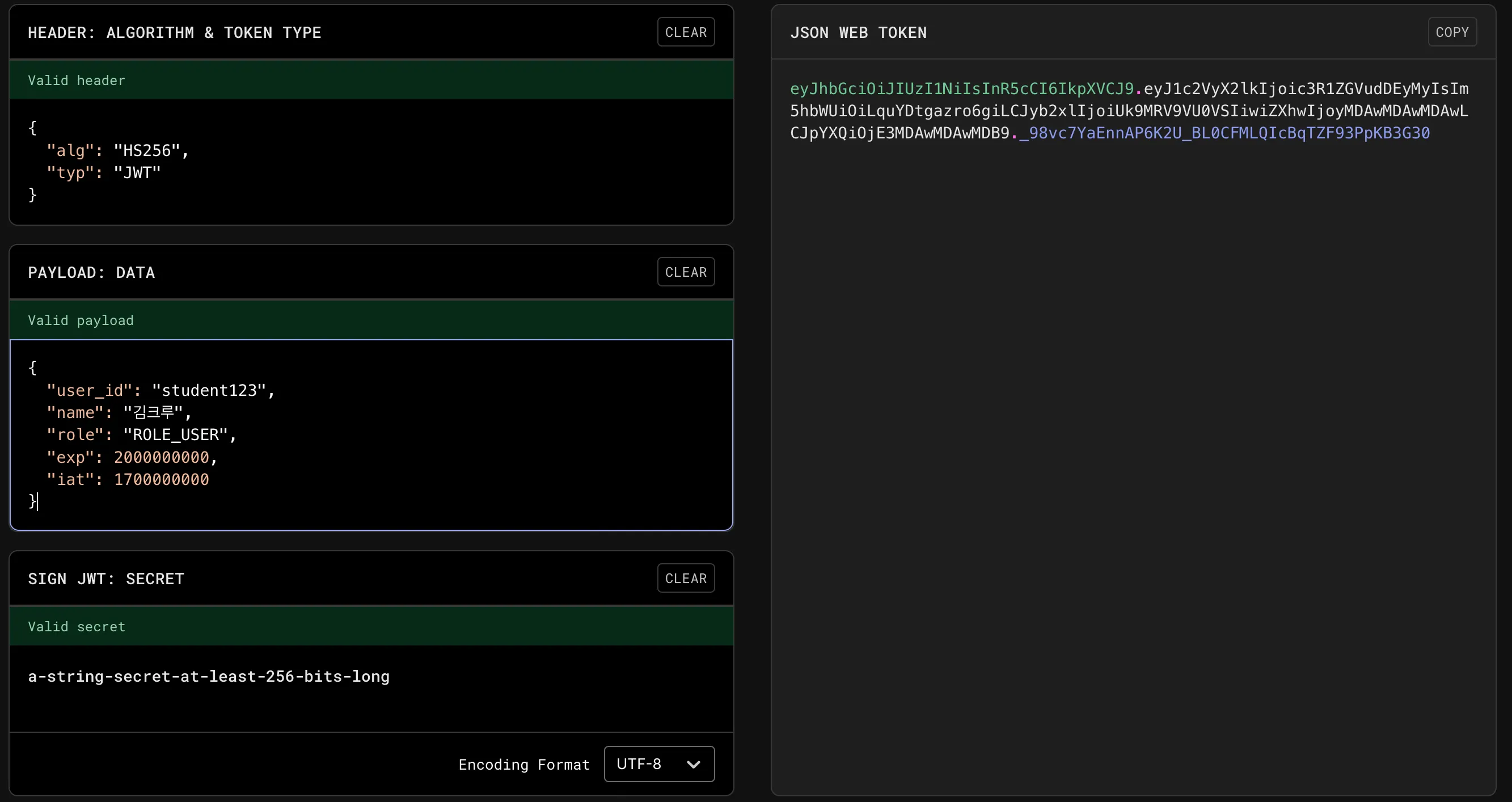 jwt.io에서 페이로드의 내용을 직접 수정하면 인코딩된 JWT 문자열이 실시간으로 변경되는데, 서버가 가진 비밀 키(Secret Key)를 모르는 상태에서 페이로드를 수정하면, 기존의 서명은 유효성을 잃게 되고 “Invalid Signature“라는 메시지가 나타난다. 서버는 토큰을 받으면 자신이 가진 비밀 키로 서명을 다시 계산하여 전달받은 서명과 일치하는지 확인한다. 만약 두 서명이 일치하지 않으면 누군가 내용을 위조했다고 판단하여 해당 요청을 거부하는 것이다. 올바른 비밀 키를 사용해야만 서명이 유효해지며 토큰이 신뢰할 수 있는 출처에서 왔음이 증명된다.
