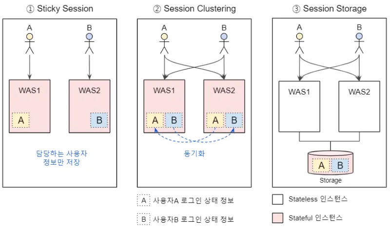 로드밸런서가 요청을 라운드로빈으로 배분하는 상황에서 로그인 직후 다음 요청이 다른 서버로 향하면, 해당 서버에 Session 상태가 없어서 다시 로그인하라는 메시지가 보이는 현상이 발생한다. 이를 해결하기 위한 전략은 크게 3가지가 있다.