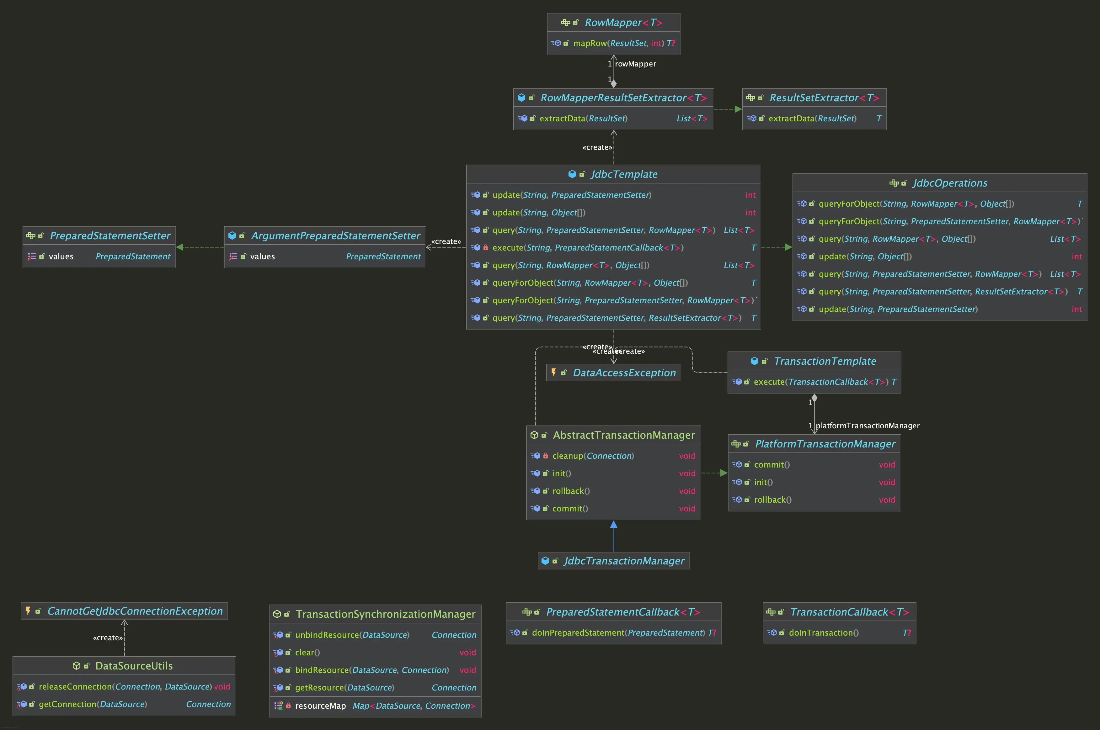 public interface JdbcOperations { int update(String sql, Object... args); int update(String sql, PreparedStatementSetter pss); <T> List<T> query(String sql, RowMapper<T> rowMapper, Object... args); <T> List<T> query(String sql, PreparedStatementSetter pss, RowMapper<T> rowMapper); <T> T queryForObject(String sql, RowMapper<T> rowMapper, Object... args); <T> T queryForObject(String sql, PreparedStatementSetter pss, RowMapper<T> rowMapper); <T> T query(String sql, PreparedStatementSetter pss, ResultSetExtractor<T> rse); }
