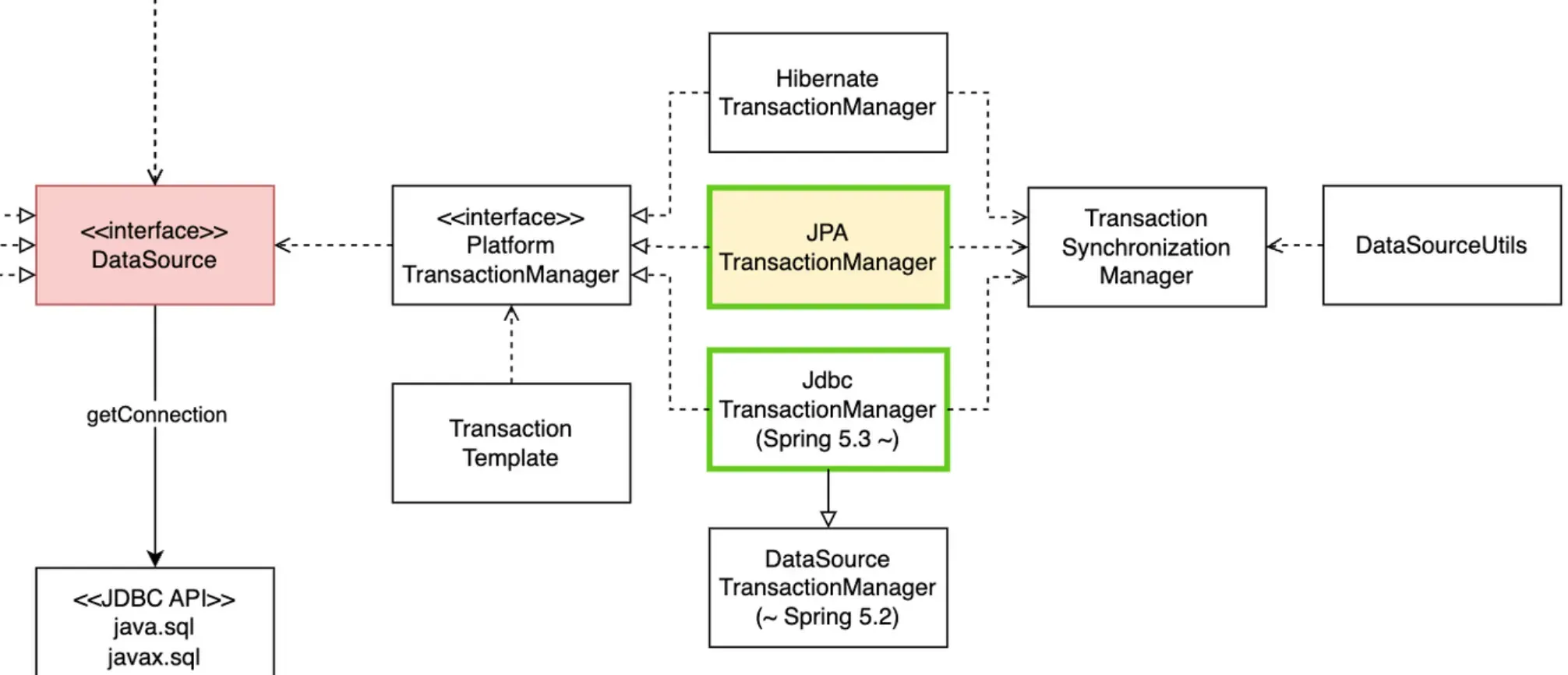 AbstractTransactionManagerPlatformTransactionManager인터페이스를 구현한 추상 클래스로, 트랜잭션 매니저 구현체들이 대부분 사용하는 트랜잭션 관리 관련 기본 메서드를 미리 구현해 놓는다. 실제AbstractTransactionManager는 트랜잭션 전파, 격리 수준에 대한 구현도 포함하고 있다.- 트랜잭션을 시작할 때 DataSource에서 Connection을 가져와