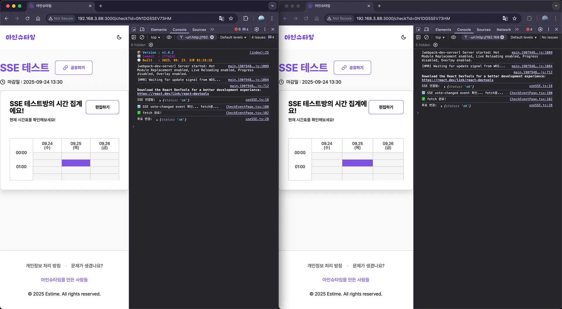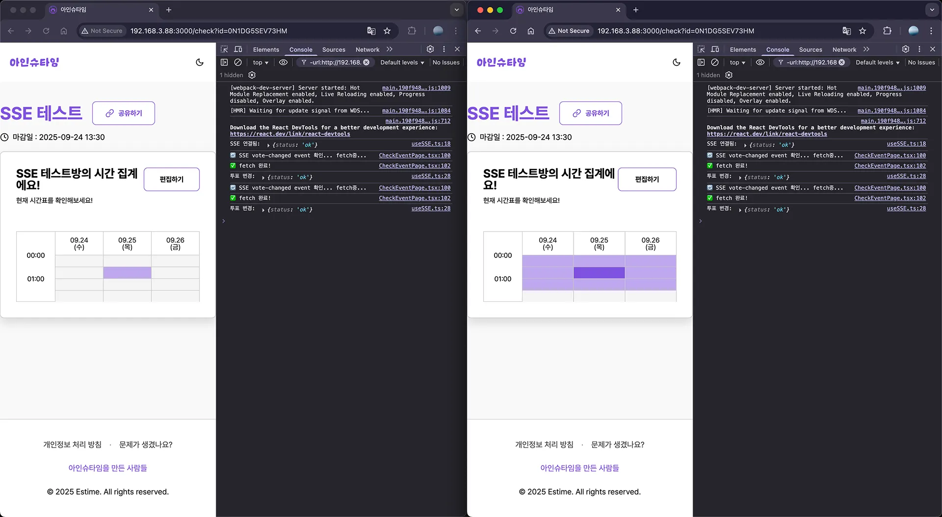- 검증: 서버의 SSE 커넥션 관리 로그와 브라우저 개발자 도구를 통해 클라이언트의 연결 상태를 추적했다.